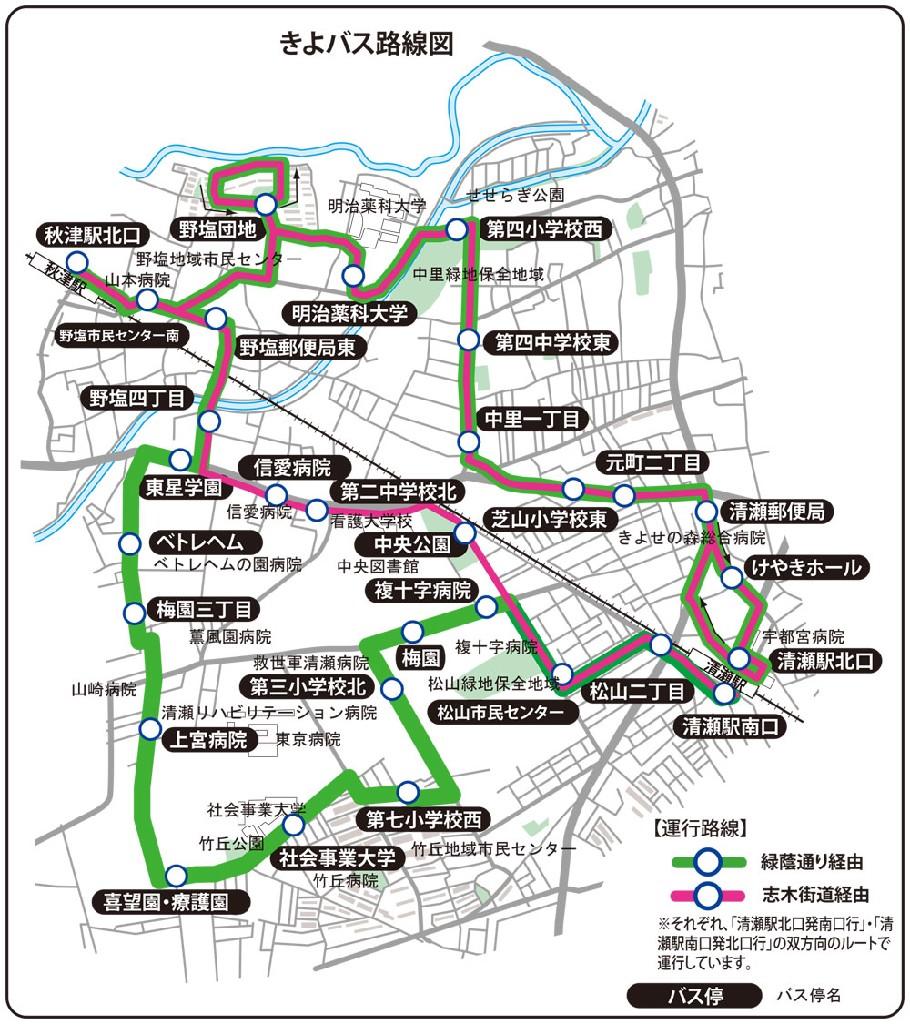 清瀬駅南口・秋津駅北口より市内巡回バス「きよバス」が運行しています。 上宮病院バス停をご利用ください。
